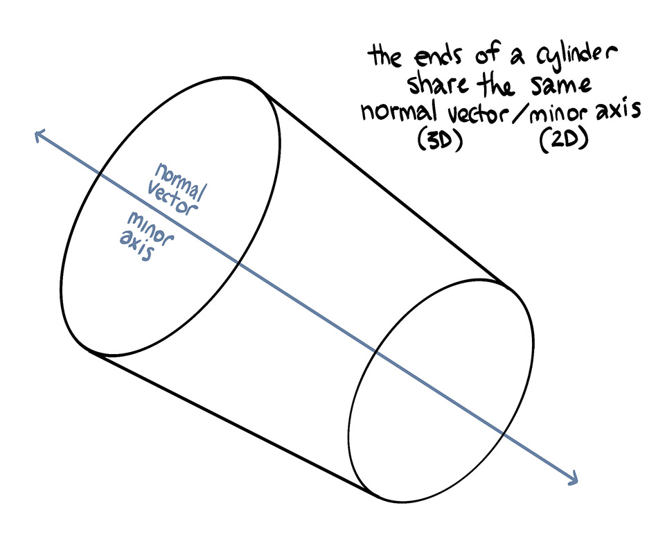 Just as the 2D ellipse represents a 3D circle, the minor axis is extremely useful to us because of how that minor axis line coincides with and aligns with the normal vector - the 3D line that shoots straight off the surface of the 3D circle, completely perpendicular to that surface.